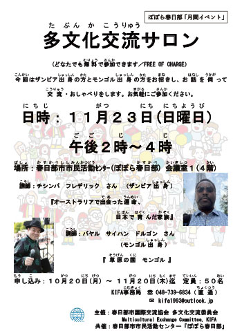 A new committee called Multicultural Exchange Committee was recently set up in the KIFA. Its main objectives are to organize activities to promote exchanges and mutual understandings between Japanese citizens and foreign citizens living in our local community. If you are interested in such activities, please join us and call the KIFA secretariat. Japanese citizens and foreign citizens are both welcome.