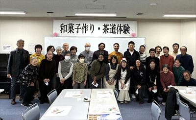 12月13日(土)粕壁市民センター大会議室において、交流拡大事業を開催しました。各教室のスタッフ、受講生合わせて33名ほどの参加を得ました。今回の交流事業は、身近な日本文化に触れてもらおうと「和菓子作りと茶道体験」でした。