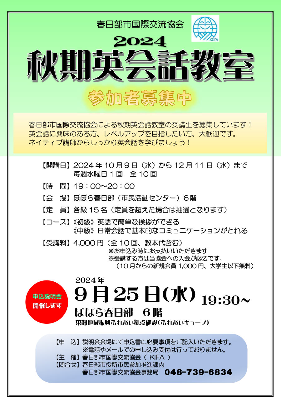 私ども春日部市国際交流協会では、地域の皆様が国際理解を深められ、外国の方々との心の交流ができるよう様々な事業をおこなっており、英会話教室では皆様が英語への苦手意識が無く、柔らかな雰囲気の中で英語を学ぶ楽しさを味わっていただけることを大切にしています。初級クラスと中級クラスの2クラスをご用意しておりますので、無理なく自然なステップで英語力を伸ばしていただけます。皆様が自信を持って英語を話せるようサポートいたしますので、世界の人々との交流にご興味ある方は是非ご参加ください。 |